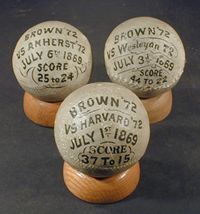 ![]() Brown's first intercollegiate football game was played with Amherst College on November 12, 1878. Their white canvas uniforms were obtained two days earlier for a fifty-dollar down payment and Brown Football Association President George Malcom's watch as security for the balance. Amherst won the game easily, scoring four tries and one goal to no score for Brown. Accounts of the game attributed Amherst success to a favorable wind, a lucky kick, and two scores gained "by the practice of a somewhat doubtful expedient," further assisted by the advantage of their superior uniforms of which it was said, "When our men got hold of an opposing runner, the jersey stretched and he either pulled away completely or added four of five yards to his journey." |