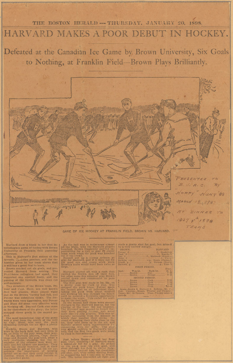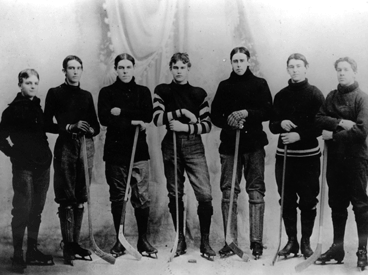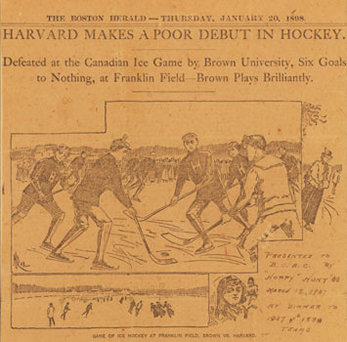 ![]() Brown's first hockey team defeated Harvard on January 19, 1898 on Franklin Field in Boston. Left to right, Robert Steere, Harris Bucklin, Jesse Povar, Captain Irving Hunt, Albert Barrows, Charles Cooke and Horace Day. |