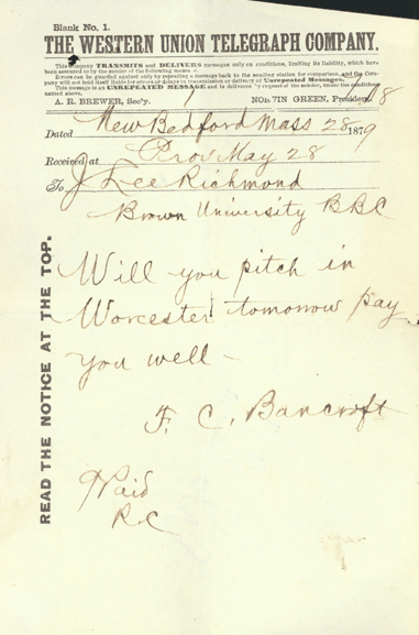 ![]() The telegrams J. Lee Richmond received attest to the informality of his pitching assignments with the Worcester team. ![]() |
