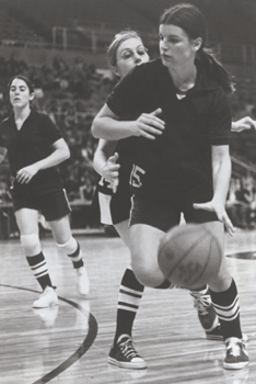 Kate Flynn '74 and Nancy Fuld '76 playing against Providence College in the first women's athletic contest held in the Providence Civic Center. Photo by Bruce Richard '74.
