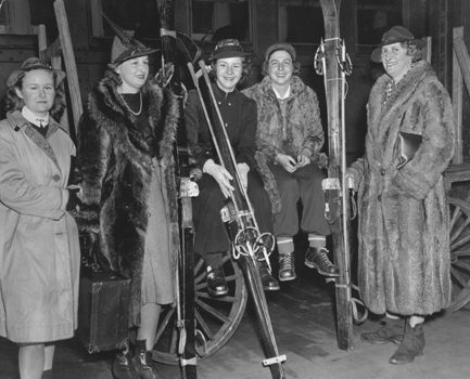 Departing for a weekend of winter sports in February 1939 are, left to right, students Polly Tirrell, Celeste Griffin, Elsbeth Beeh, and physical education faculty Florence Sayward and Bessie Rudd.