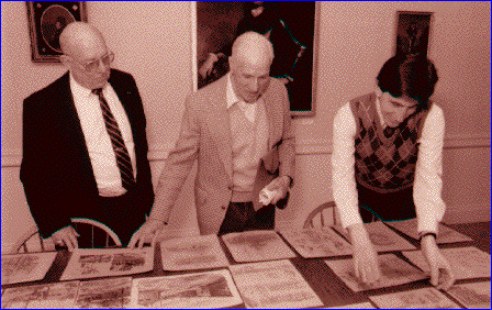 Looking over a collection of drawings and water colors of a World War II German POW camp are (L to R) Military Researcher Robert W. Kenny, Jr. '55, the artist, William M. Capece of Lincoln, RI, and Peter Harrington, Curator of the Anne S. K. Brown Military Collection. Capece, a flyer who was shot down over Munich, has donated his drawings to the Military Collection. See related story