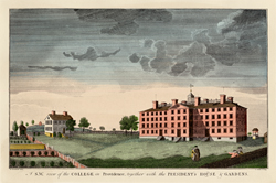 David Augustus Leonard, College Edifice and President's House. Colored reproduction of circa 1795 engraving (Providence, 1968).Through subsequent subscription drives, appropriations made by the Corporation, and student library fees, the College, for the first time, bought sizeable numbers of new books for the library. With £222 of the 1784 fund, 1,400 volumes were selected by President Manning and Chancellor Stephen Hopkins and ordered from the firm of James Buckland in London. These books, primarily in the fields of English history and literature, represented one of the first, and by far the largest, efforts by the College to buy books systematically to support the curriculum.