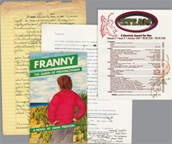 Gay and lesbian literature had been incorporated into other John Hay Library collections for many years, prime examples being gay poetry and plays accumulated through the Harris Collection’s policy of comprehensiveness. Building upon this existing strength, and in recognition of the growing public prominence of the gay and lesbian presence throughout society, a decision was made early in the 1990s to collect prose writing by and about the homosexual experience. The focus was primarily literary in nature but it extended to published, manuscript, and archival material that documented the changing status of the gay and lesbian community, from the AIDS crisis to such contentious issues as gay marriage and gays in the military. The Richard G. Katzoff Collection, donated by his family in 1991, served as the catalyst for future acquisitions, most of them by gift or bequest. Substantial donations of books were received throughout the decade, highlights being the James Jackson Collection, a continuing gift from A. Christian Fredrick, and more recently, a sizeable collection given by Ronald L. Smith. A large collection of gay pulp paperback novels was acquired in 1996, adding a new facet to the library’s genre literature holdings. Complementary collections arriving in the 1990s included the archives of On Our Backs, a Lesbian-oriented magazine, donated by Melissa Murphy, Class of 1990, and the files of authors John Preston and Scott O’Hara, whose extensive correspondence provided unique perspectives on gay political and social activism as well as gay literature. These have been joined by additional author archives, examples being the papers of Michael Lowenthal, Rudy Kikel, Danny Sotomayor, Barbara Deming, and John C. Russell, MFA Class of 1991.