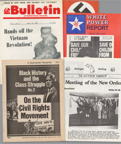 As the scope of the John Hay’s literature collections expanded in the 1990s, so too did the focus of American history. At the turn of the decade the library purchased, over a period of years, the 300,000-piece Hall-Hoag Collection of Dissenting and Extremist Printed Propaganda. Begun by Gordon Hall just after World War II, the collection gave equal attention to right-wing and left-wing movements from the time of McCarthy through the civil rights movement to Vietnam and such social movements as feminism and gay rights. Hall, joined in his collecting activities by Grace Hoag in the 1960s, amassed a collection that has no equal in terms of its size and in the breadth of its scope. Regardless of the topic or the nature of the dissenting movement, researchers will find resources that are often unobtainable elsewhere and certainly not in the sheer volume in which they are present at Brown. The American Communist Party, the Lyndon LaRouche organization, pro- and anti-abortion groups, the Ku Klux Klan, religious cults, neo-Nazi groups, all are represented in depth. Subsequent to its arrival at Brown, the Hall-Hoag Collection has attracted gifts of complementary materials, including left-wing documents donated by the Lucy Parsons Center and a large body of records from the John Birch Society, donated by Political Research Associates.