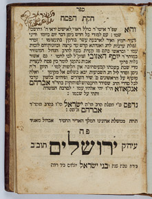 This is the second Haggadah to be printed in Jerusalem; it was produced just two years after the founding of Bak’s pioneering press in that city. In addition to the Haggadah, the text includes prayers and readings for the entire month of Nissan, a commentary on the Passover Seder composed by Abraham Ankawa, as well as the ethical treatise Pirkei Avot (Ethics of the Fathers) and Shir Ha-Shirim (Song of Songs).