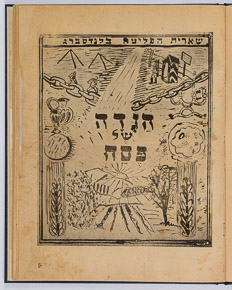 The Landsberg Displaced Persons camp, 72 kilometers west of Munich, was set up in May 1945 in what had been the German Army base of Saarburg Kaserne. Until September of that year, the DP camp housed both Jewish survivors and non-Jewish political prisoners. The political prisoners thinned out as they were repatriated to their home countries, but the Jews, most of whom had no homes or families to return to, remained at Landsberg. Those who survived and were housed in the DP camp called themselves the She'erit Hapletah (the Saved Remnant). With the assistance of the Jews from Palestine who came to work among them, they began to prepare themselves to make aliya. The cover of this Haggadah published in the Landsberg DP camp in 1946 features the Hebrew words She'erit Hapletah (the Saved Remnant). At top left, an image of the pyramids indicating ancient slavery, is juxtaposed with that of a Concentration Camp at right. At the bottom of the page, the sun rises over a fertile landscape of Israel – a promise of better things to come.