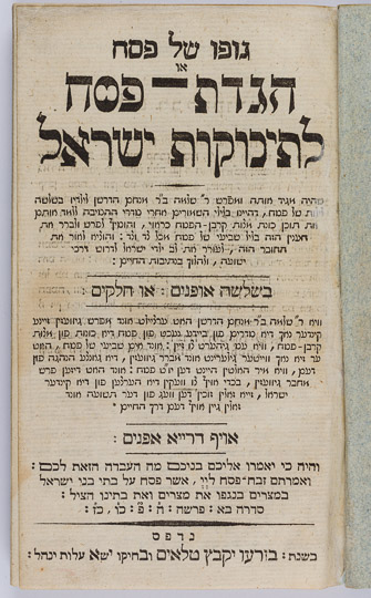 This Haggadah appears to be an explanatory Haggadah for children but is, in reality, a missionary tract. The work, written in a Yiddish purports to be a three part explanation of Haggadah and Passover story but was actually "published . . . to rouse the hearts of Jewish children to seek the path of salvation."