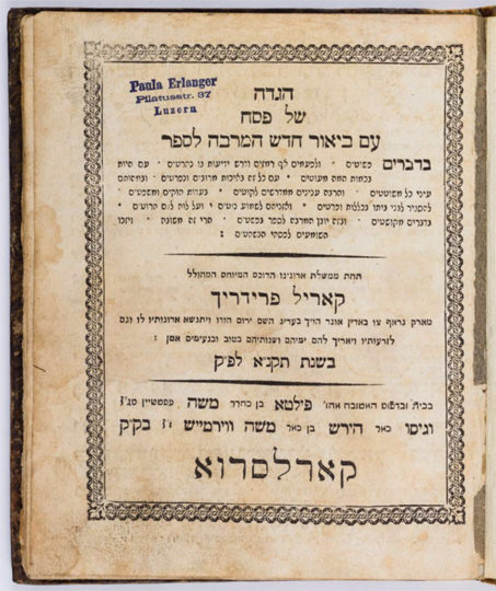 The title page of this haggadah documents the Jewish community’s appreciation for their ruler Charles Friederich and includes praise and the wishes that God “exalt his glory and uplift his sovereignty.
