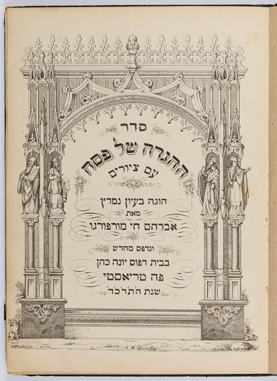 The most distinguished illustrated edition of the haggadah produced in Europe during the nineteenth century. Edited by Abraham Hai Morpurgo, scion of a noted scholarly Italian-Jewish family and featuring vivid illustrations expertly executed by Kirchmayer.