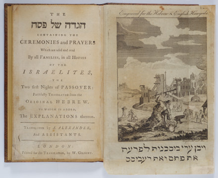 The first edition of the Haggadah with an English translation, by "A. Alexander and Assistants" and printed for him, was published in London in 1770, and accompanied by an explanatory introduction and notes. Facing the title page is a frontispiece whose engraved Hebrew legend declares, "And they built for Pharaoh store-cities Pithom and Rameses." Depicted are (anachronistically medieval) towers being built, slaves laboring, and Moses slaying the Egyptian.