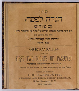 An edition of the first illustrated Haggadah in America to show influences of the new environment. An American family seated at the seder table presents a new version of the depiction of the "four sons" described in the haggadah. The Wise Son, kippah (or skullcap) on head, is looking at the haggadah before him. The Wicked Son, bare-headed, his chair tilted back, is smoking a cigarette.