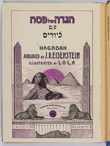 This haggadah was illustrated by LOLA, a pseudonym for the artist Leon Israel (1887-1955). Leon Israel was a cartoonist for the Jewish Daily Forward and was also the major original artistic contributor to the weekly Groyser Kundes, the popular satirical magazine in the Yiddish language (published in New York, 1909-27). Israel was born in Pinsk, Russia and came to the USA in 1905. He was a highly regarded artist in the fields of Jewish art, theatrical productions and newspaper circles.